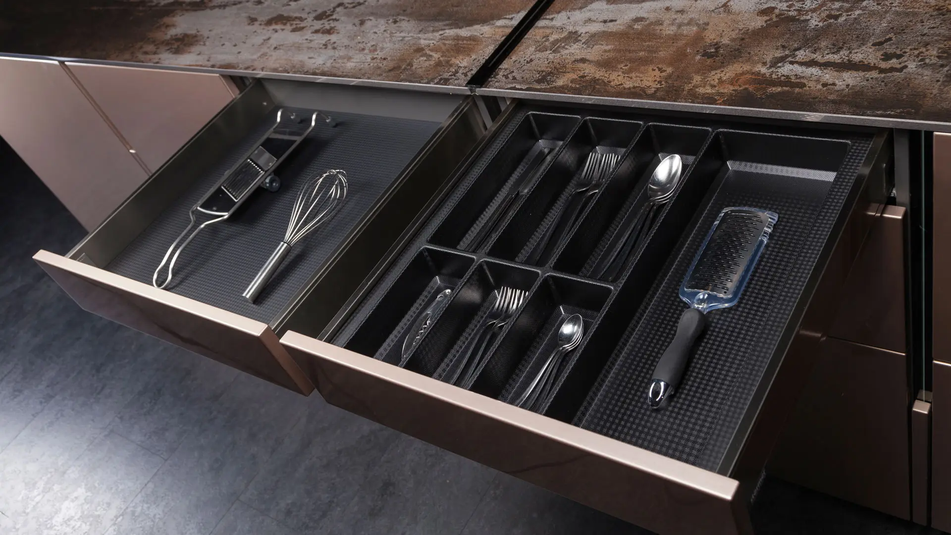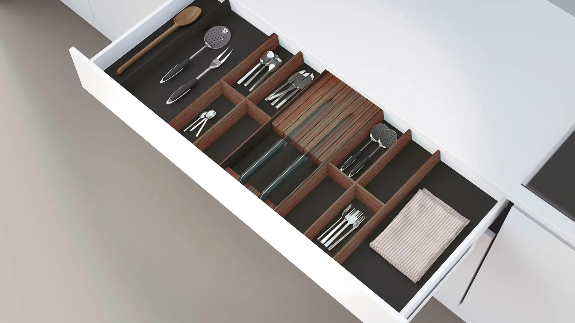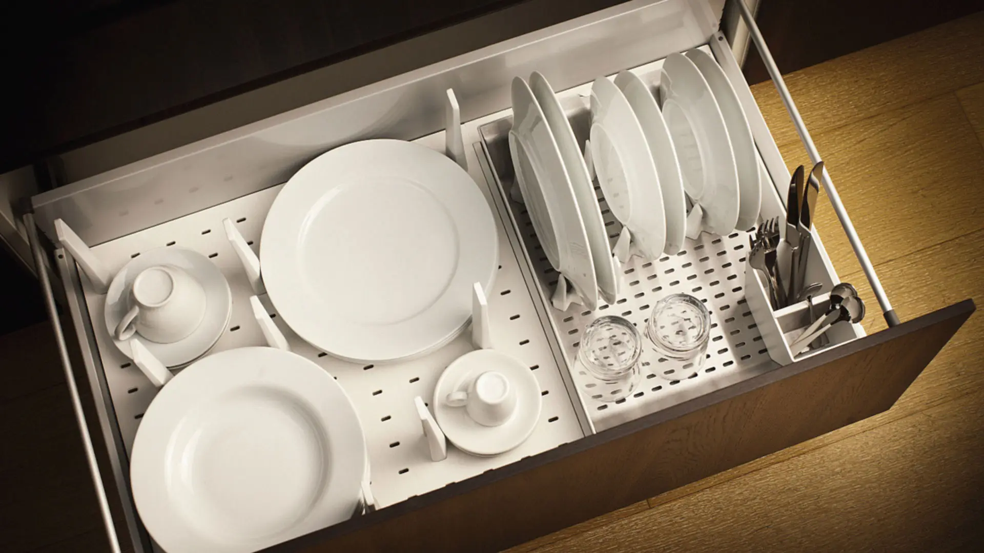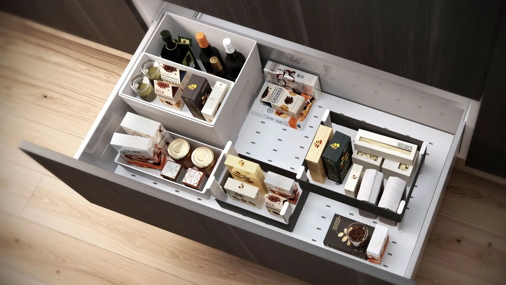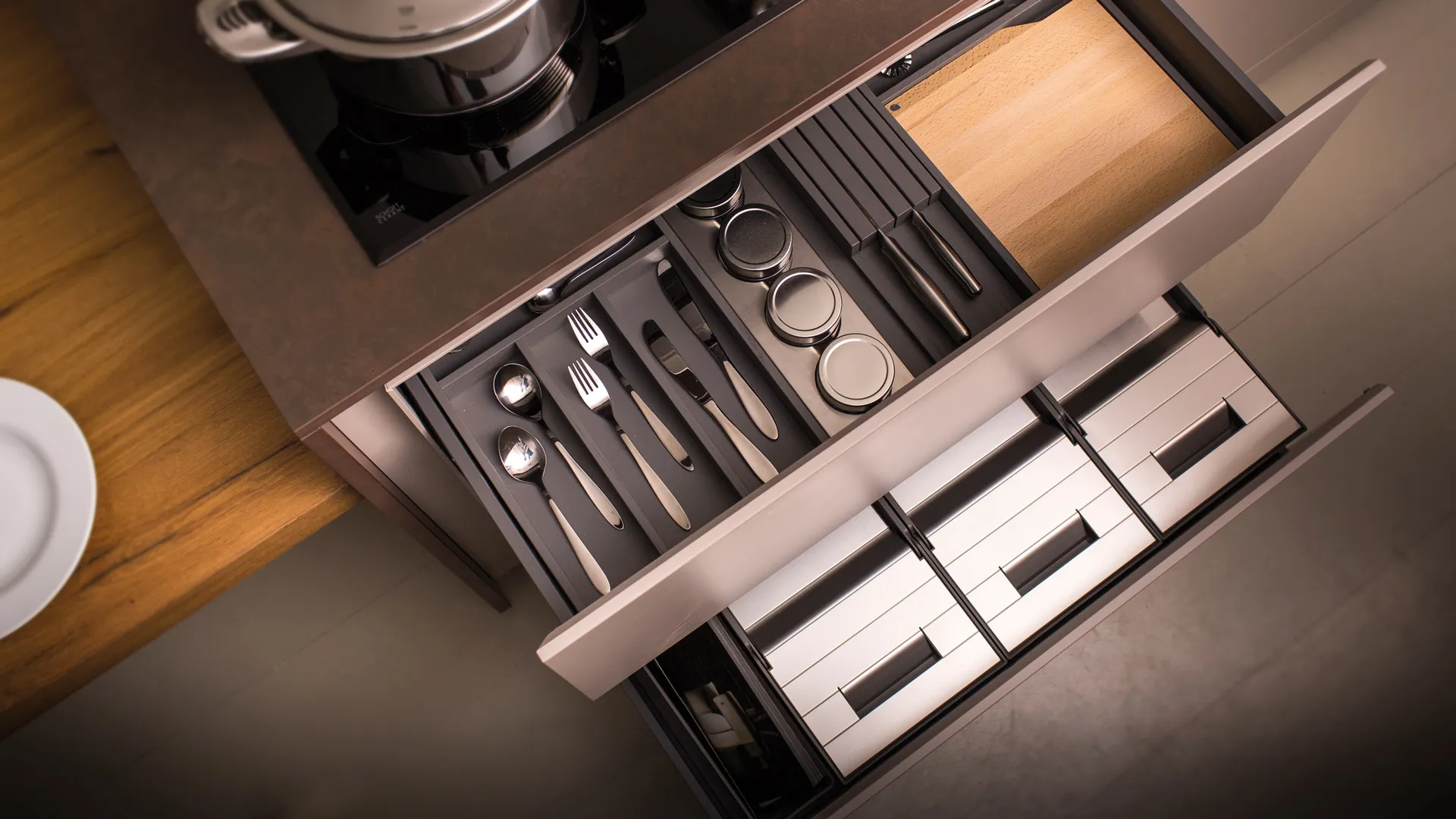 Visibilidad, orden y sobre todo, un rápido acceso son decisivos en el día a día de tu cocina. Nuestros accesorios de cajón estudiados minuciosamente te proporcionan un sistema perfecto de organización.